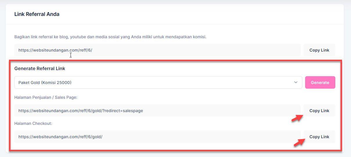 Anda bisa menggenerate link affiliasi untuk paket Silver/Gold/Reseller Lalu mempromosikan / membagikan link aff-nya. Link affiliasi bisa diarahkan ke halaman salespage ataupun langsung ke halaman pembelian (checkout).