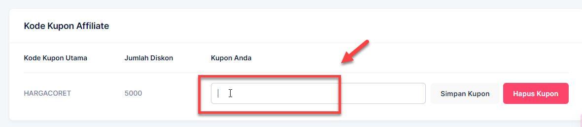 Buat kupon anda sendiri untuk melakukan penguncian sales dari affiliate produknya. Isikan kodekupon Anda dan simpan kuponnya untuk dibagikan dan mengunci pembelian affiliasi Anda.